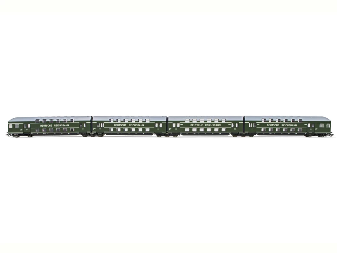 Vorbild: Nach dem Zweiten Weltkrieg stand die Deutsche Reichsbahn durch den beginnenden Wiederaufbau der Industrie vor der Herausforderung, große Verkehrsströme in den Ballungszentren schnell bewältigen zu müssen. Daher wurden ab 1952 neue und für die damalige Zeit moderne Doppelstockzüge beschafft. Bis 1974 sind 152 vierteilige Züge aus verschiedenen Baulosen sowohl mit als auch ohne Steuerabteil in Dienst gestellt worden. Im Laufe ihrer Einsatzzeit veränderte sich das Farbkleid der Doppelstockzüge mehrfach. Die in den 50er Jahren gelieferten Einheiten waren ursprünglich in dunklem Grün mit grauem Dach und schwarzem Rahmen gehalten. An den Seitenwänden zierte sie der Schriftzug DEUTSCHE REICHSBAHN. Anfang der 70er wurde dann auch der Rahmen in Grün lackiert und der Schriftzug an den Seitenwänden wich einem Logo, welches ein stilisiertes Flügelrad darstellt. Mit Einführung eines neuen Farbkonzeptes in den 80er Jahren verwendete man nun einen helleren Grünton und das Dach wurde rehbraun lackiert.