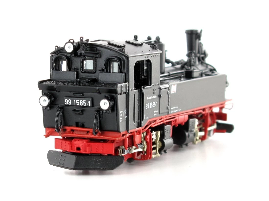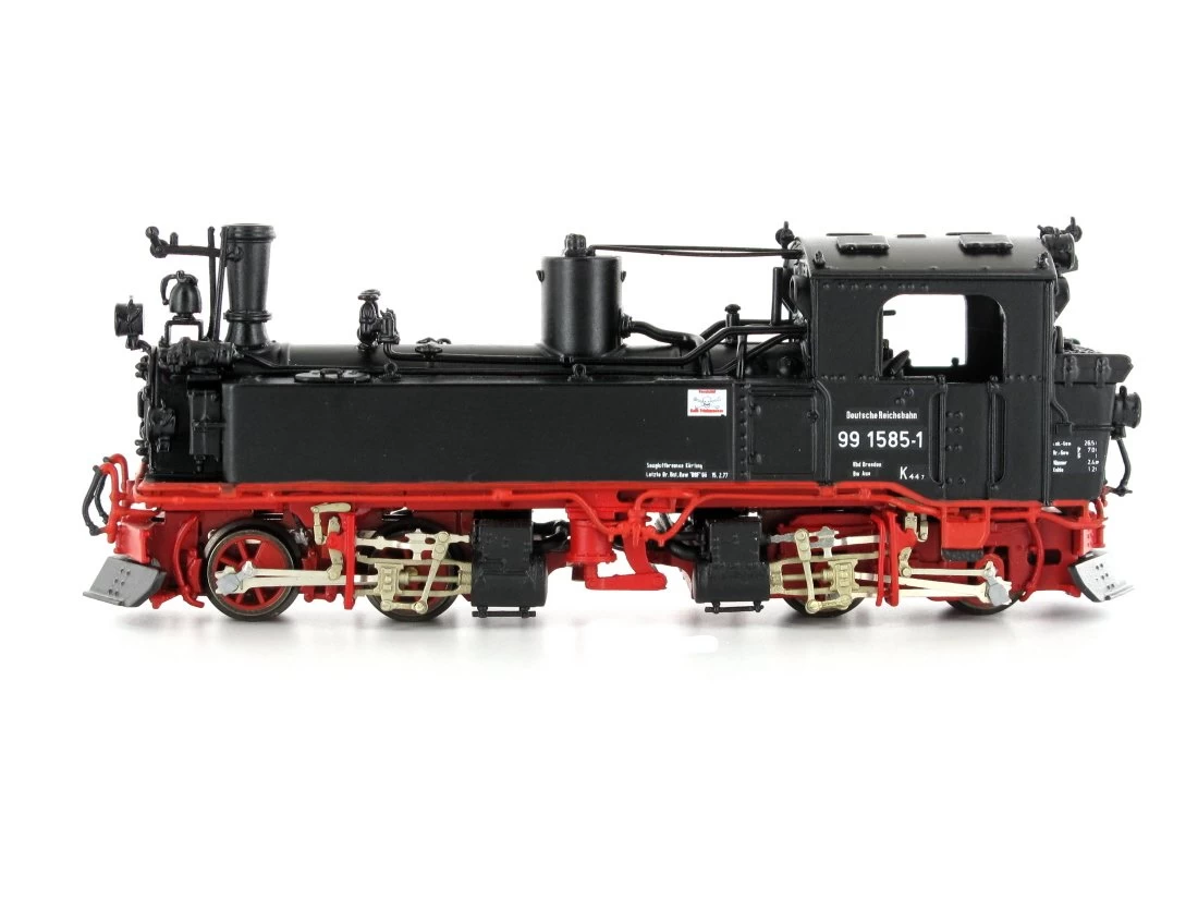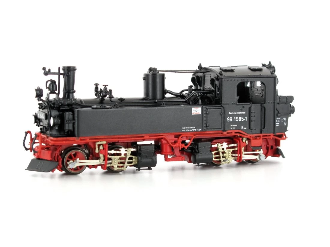 Modell: Spur H0e. Dampflokfertigmodell Baureihe 99 (sächsische IV K) der DR, Betriebsnummer 99 1585-1. Kleinserien-Handarbeitsmodell in Weissmetall und Messingbauweise, Faulhaber-Glockenankermotor mit Schwungmasse, Antrieb und Stromaufnahme über alle Treib- und Kuppelachsen, 6-polige Steckschnittstelle NEM651, Kupplungen liegen zur Selbsmontage bei.