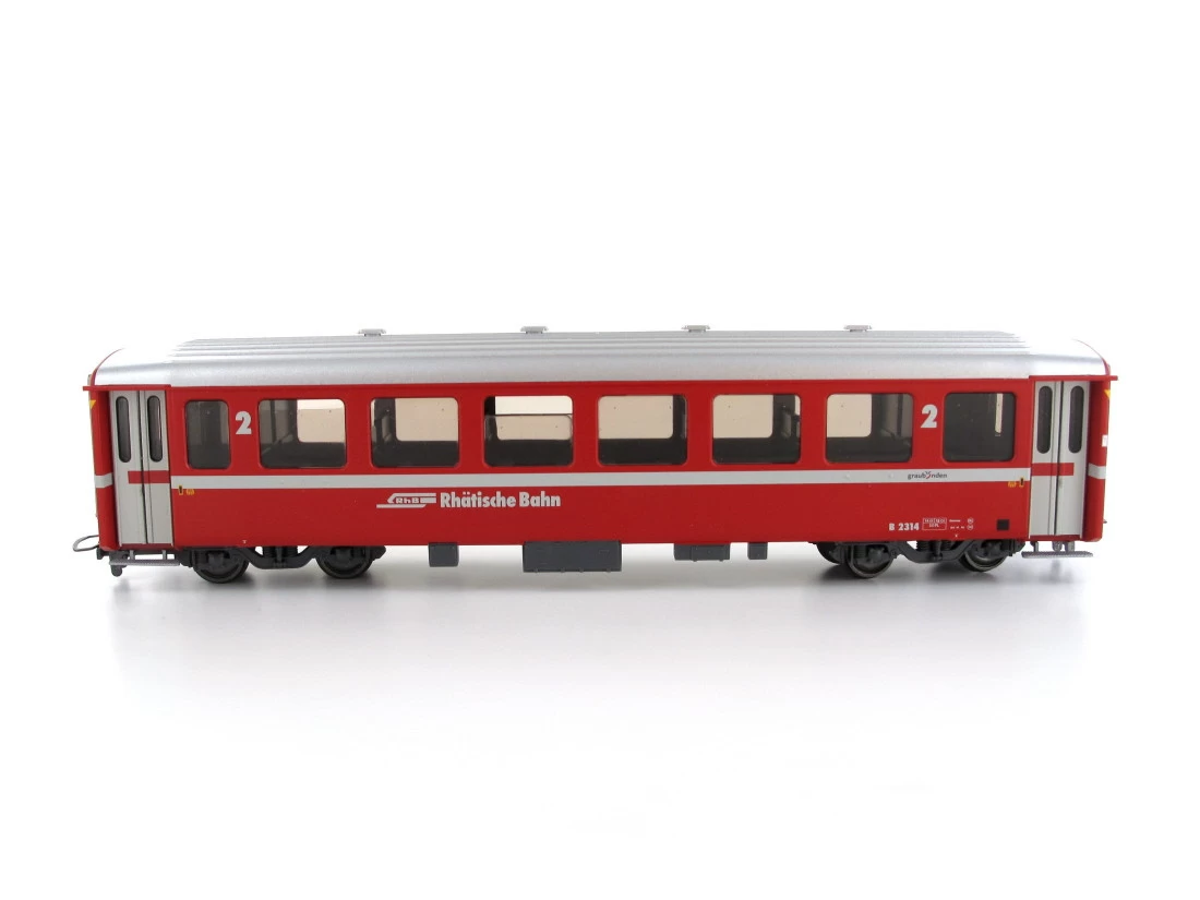 Modell: Spur H0m Gleichstrom. Neuauflage der für die Berninalinie verkürzten Einheitswagen EW I im aktuellen Erscheinungsbild in neuroter Farbgebung mit breitem Zierstreifen, ohne Türgriffstangen sowie orangen Bremsecken.