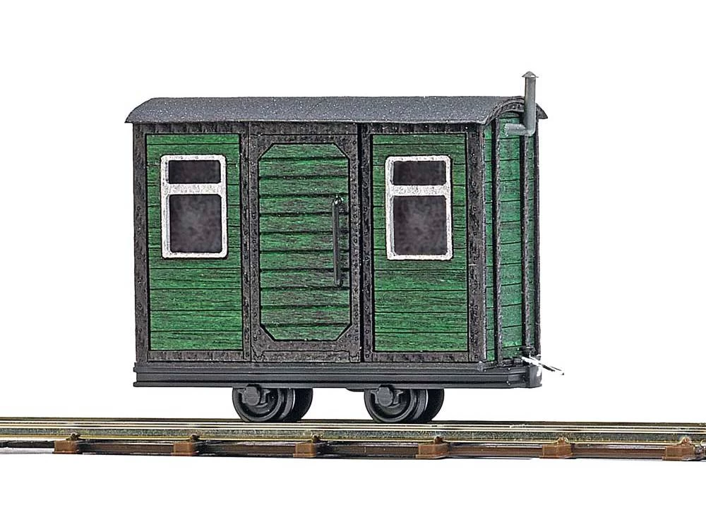 Feldbahnwagen mit grünem Aufbau aus echtem Holz. Als Bau- oder Aufenthaltswagen einsetzbar. Mit filigranen Türen, Türgriffen, Fenstern, Verglasungen und Schornstein. Länge: 36 mm. Diese Feldbahnwagen sind mit vorbildgetreuen Hakenkupplungen ausgestattet und daher auch mit den Loks und Mannschaftswagen aus dem Busch Grubenbahnsortiment kompatibel.