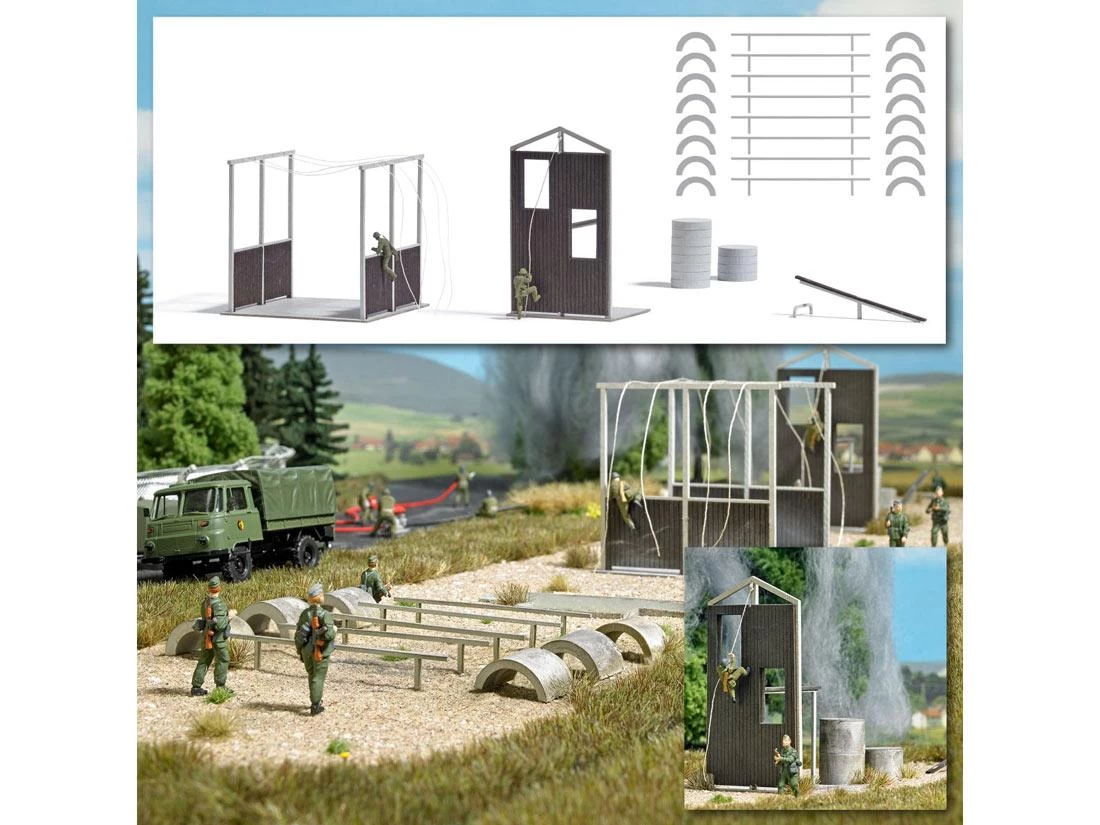 Modell: Spur TT. Die Sturmbahn ist eine militärische Ausbildungsanlage, mit deren Hilfe Körperkraft, Ausdauer, Beweglichkeit und Schnelligkeit der Soldaten geschult werden soll. Sie besteht aus verschiedenen Hindernissen, die vom einzelnen Soldaten oder im Gruppenverband überwunden werden müssen. Bei diesem Bausatz sind die wesentlichen Elemente einer Sturm- und Gefechtsbahn originalgetreu dargestellt: Kriech- und Übersteigehindernis aus Betonröhren und Querbalken, Anlage mit Horizontaltau, Giebelwand mit anschließendem Balken und Betonelementen sowie eine Wippe. Mit 2 NVA-Soldaten in verschiedenen Positionen zum selbst Bemalen. Empfohlene Aufbaulänge der Anlage: ca. 350 mm.