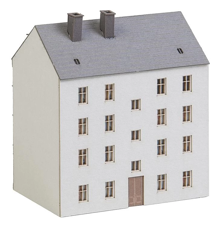 Modell: Spur Z. Großstadtflair. Vierstöckiges Wohnhaus mit Brandmauern und Satteldach. Zur willkommenen Belebung der Fassade tragen dekorative Verdachungen und die farbige Einfassung der Fenster bei.
