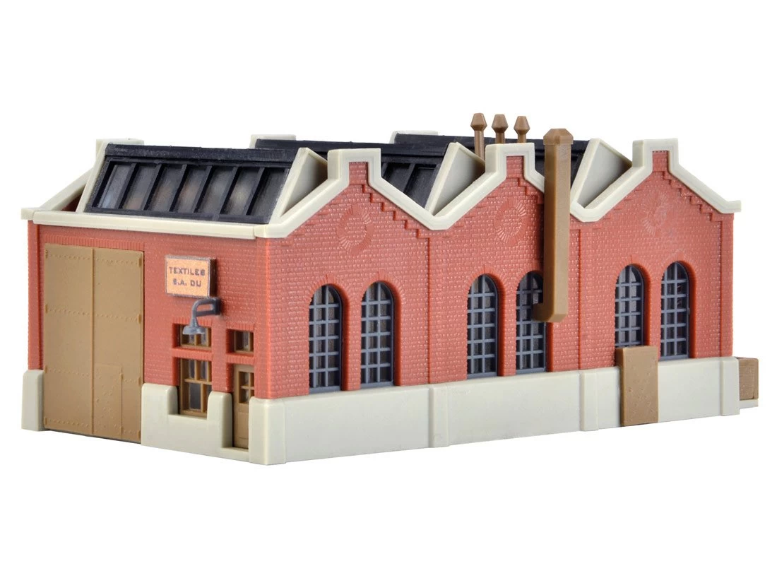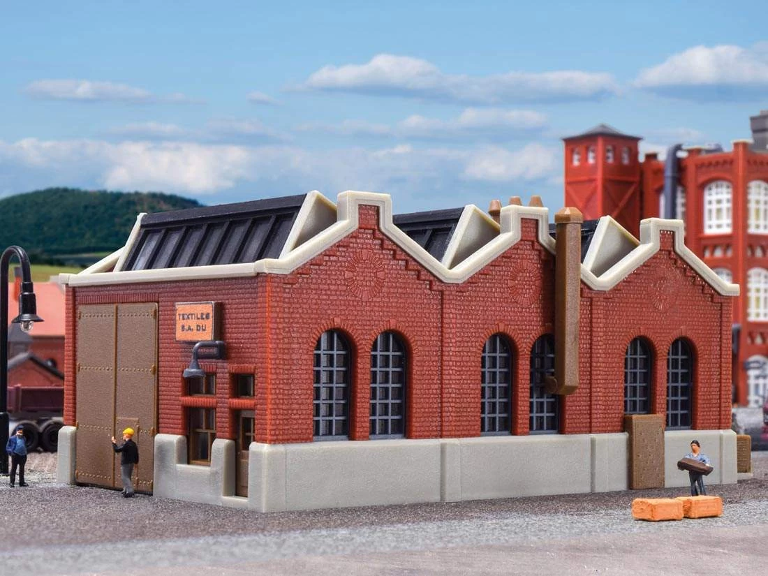 Modell: Spur Z. Bausatz. Diese Halle lässt sich beliebig neben- und hintereinander in Reihe aufstellen. Separat kann sie z. B. eine einzelne Produktionsstätte darstellen.