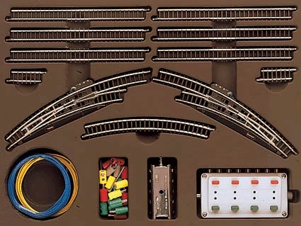 Inhalt: 8 gerade Gleise, 2 gebogene Gleise, 2 elektromagnetische Bogenweichen, Stellpult, Verteilerplatte, Anschlussmaterial und Aufbauanleitung.
