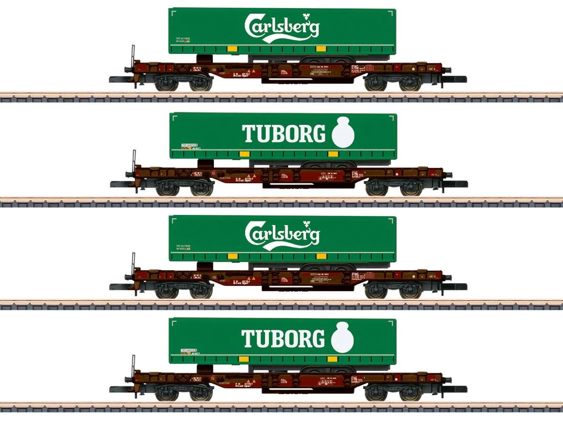 Modell: Spur Z Gleichstrom. Fahrwerk der Taschenwagen jeweils aus Metall. 2 Wagen jeweils beladen mit einem Sattelauflieger „Tuborg“ und „Carlsberg“. Feine Farbgebung und Beschriftung. Alle Wagen und Sattelauflieger mit unterschiedlichen Nummern. Eingebaute Kurzkupplungshaken.