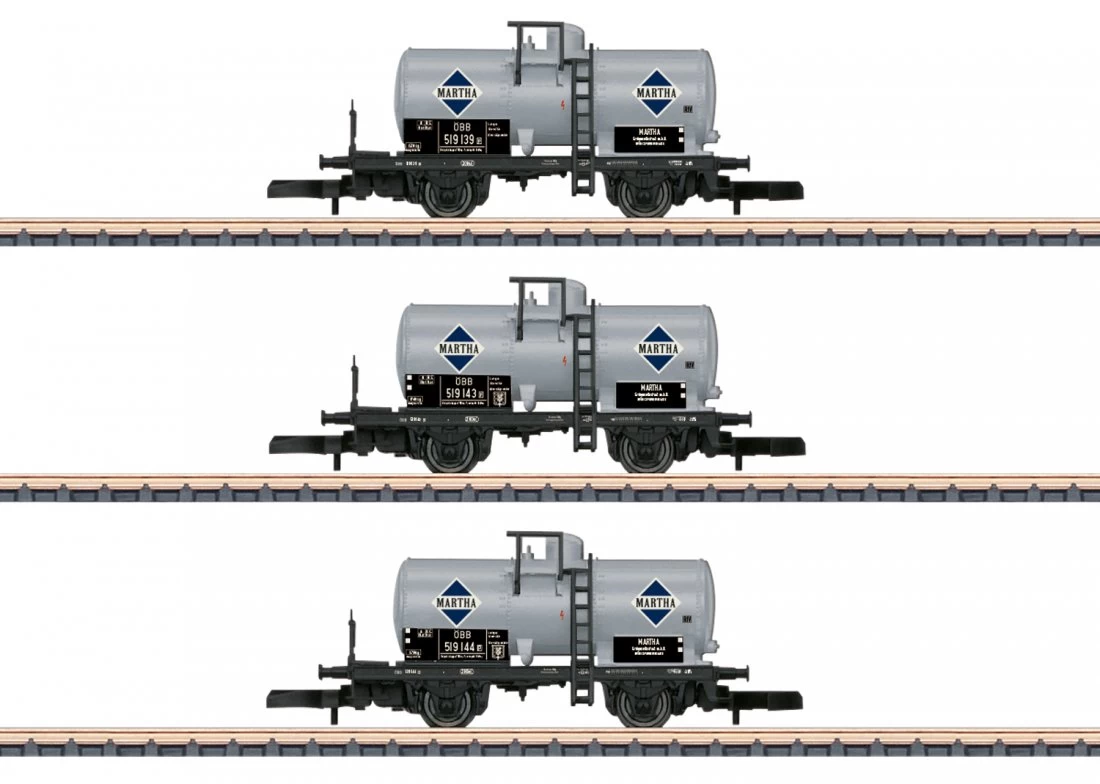 Modell: Spur Z Gleichstrom. Alle 3 Kesselwagen vorbildgerecht umgesetzt. Schwarze Scheibenräder. Wagenlänge über Puffer 124 mm.
