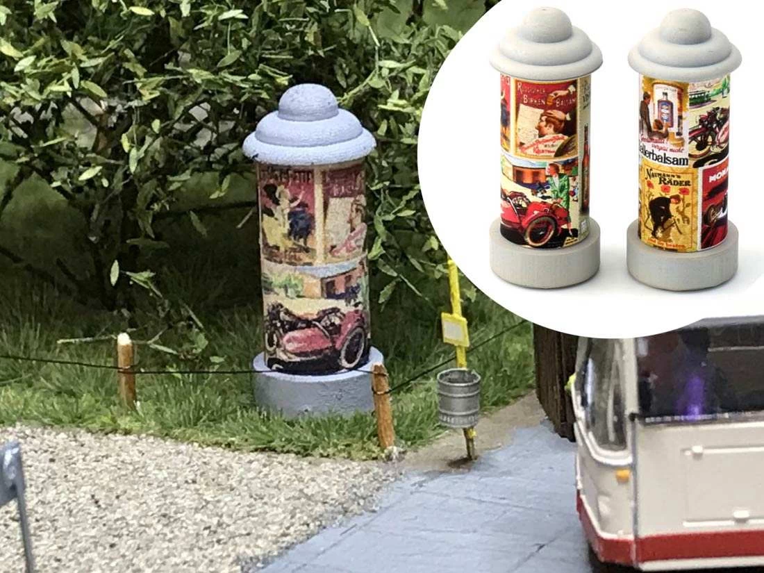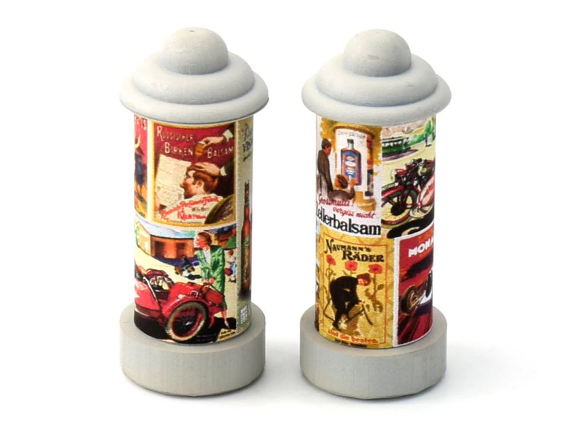 Modell: Spur TT. Zwei Litfaßsäulen, Fertigmodelle, bemalt, ohne Plakate. Am 5. Dezember 1854 bekam Ernst Litfaß die erste Genehmigung für seine „Annoncier-Säulen“. Im Jahre 1855 wurden in Berlin die ersten 100 Litfaßsäulen aufgestellt und nach dem Erfinder benannt.