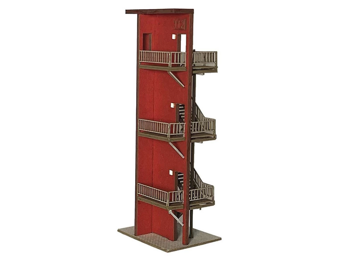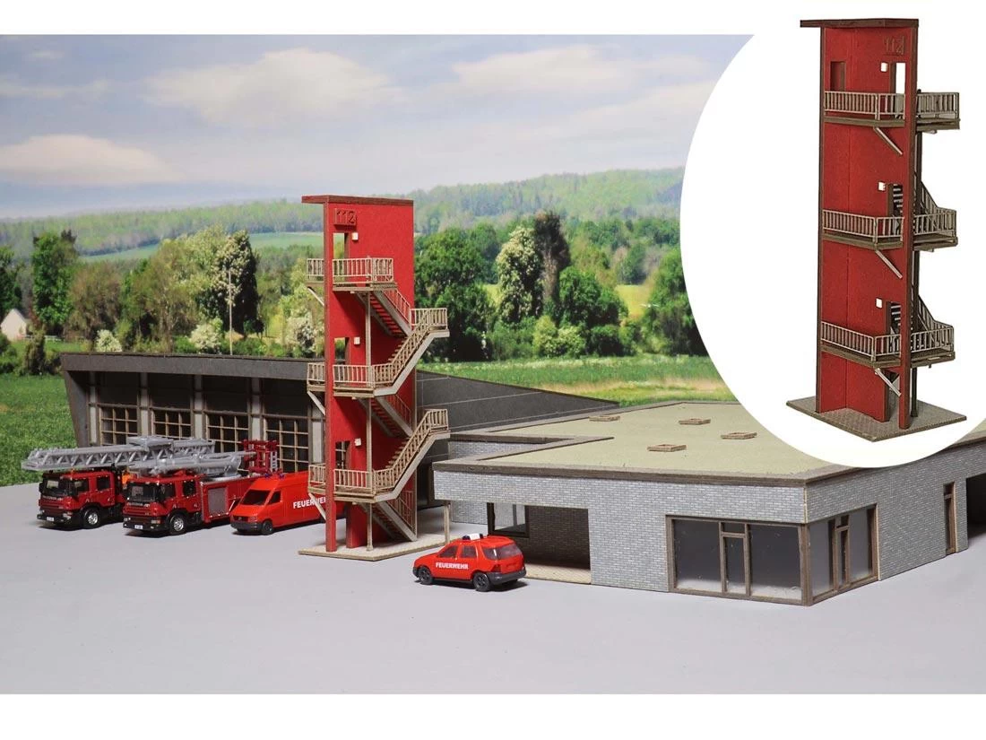 Modell: Spur TT. Feuerwehr Übungsturm der freiwilligen Feuerwehr Issum Sevelen. Lasergeschnittener Bausatz aus Grafikkarton. Abbildungen zeigen teilweise nicht enthaltenes Zubehör.