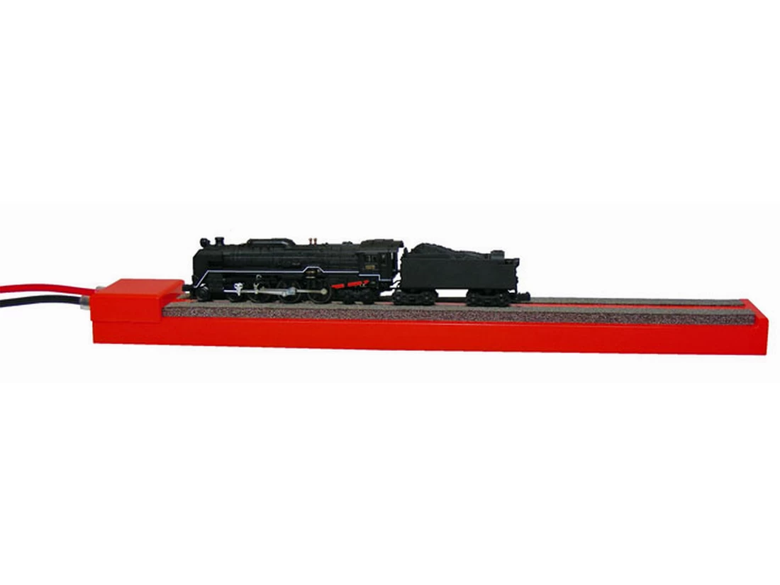 Anwendung: Verbinden Sie die Krokodilklemmen mit einer Schiene auf der Anlage oder dem Steuergerät, und stellen Sie die Lok auf den Rad-Reiniger. Die Geschwindigkeit kann über den Steuergerät geregelt werden. Die Lok sollte dabei mit leichtem Druck auf dem Rad-Reiniger gehalten werden.