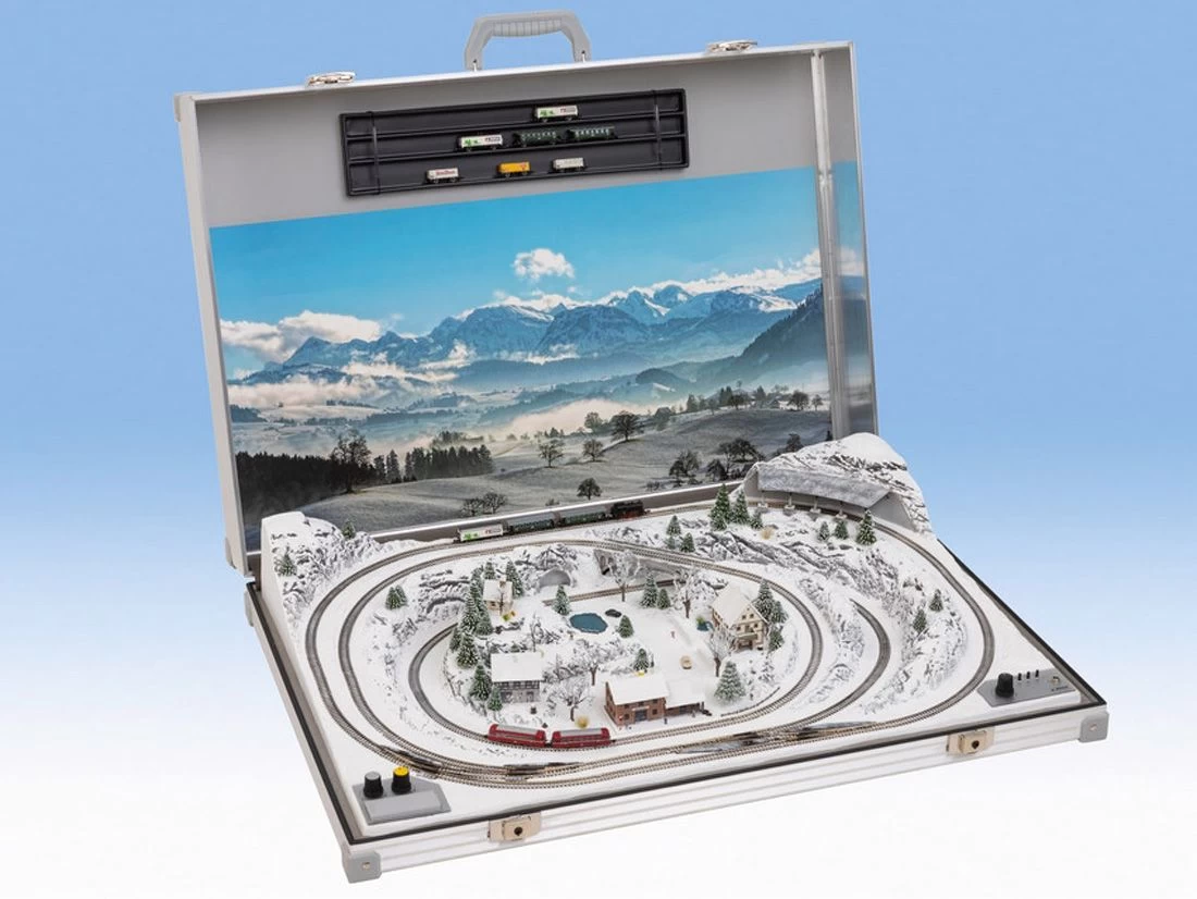 Modell: Spur Z. Fahrfertige Modellbahnanlage im Aluprofil-Koffer (Außenmaße Koffer: 79,5 x 54,5cm, 16cm hoch), Gelände aus Struktur-Hartschaum, komplett ausgeschmückt, Zwei Bahnstromkreise, fahrfertig montiert, Vier beleuchtete Gebäude, Steuerpult mit zwei Fahrreglern, Batteriefach für eine 9-V-Blockbatterie, Anschlussmöglichkeit für externes Steckernetzgerät (im Lieferumfang enthalten). Ausgestattet mit Märklin Gleisen.