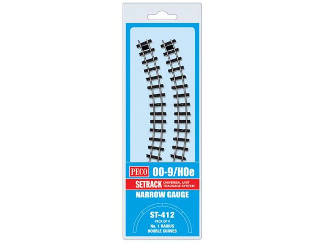 Modell: Spur H0e. ST-412 Code 80 Setrack Gleis gebogen mit Holzschwellen-Nachbildung, Radius 228 mm, Winkel 45 Grad.