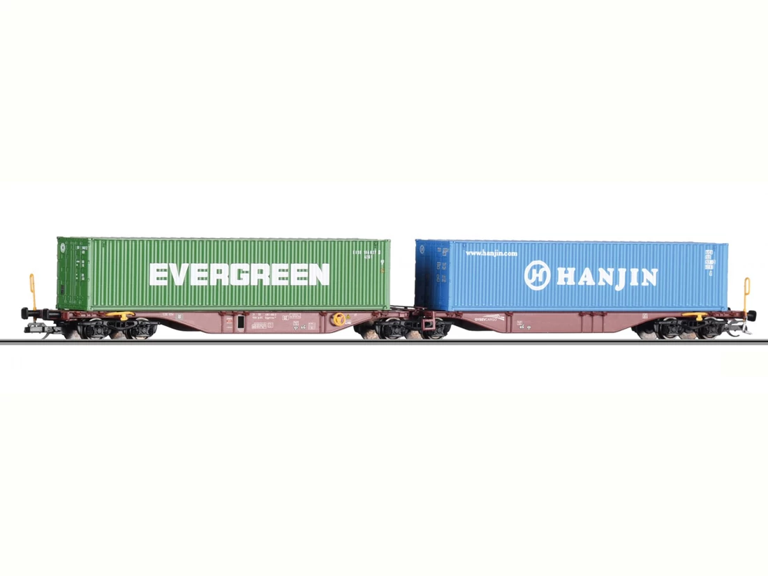 Modell: Spur TT Gleichstrom. Containertragwagen Sggmrss der GySEV Cargo, beladen mit zwei 40‘-Containern.