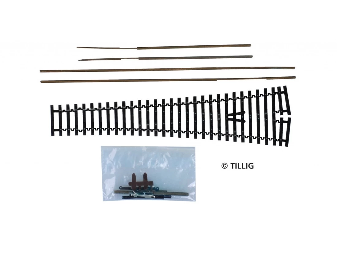 Modell: Spur TT. Gleis Flexsteg Bogenweiche BW15 Grad Bausatz brüniert. Das Tillig TT-Modellgleissystem mit 2,07 mm hohen Schienenprofilen aus Neusilber hat neben blanken auch brünierte Schienenprofile. Weichen sind mit verschiedenen Herzstückwinkeln im Sortiment. Neben einfachen Weichen gibt es zahlreiche weitere Formen wie Innenbogen-, Außenbogen- und Doppelkreuzungsweichen, doppelte Gleisverbindungen und Dreiwegeweichen. Zusätzlich zu den angebotenen Gleisradien gibt es Flexgleise mit verschiedenen Schwellenarten: Holzschwelle, Stahlschwelle und Betonschwelle. Außerdem werden fast alle Gleiselemente auch als Bausatz angeboten. Ergänzt wird das Modellgleissystem durch die STYROSTONE®-Gleisbettung mit echtem Schottermaterial. Damit erhalten die Gleise auf schnelle und einfache Art ein Schotterbett, ohne dass ein aufwendiges Einschottern per Hand notwendig wird.