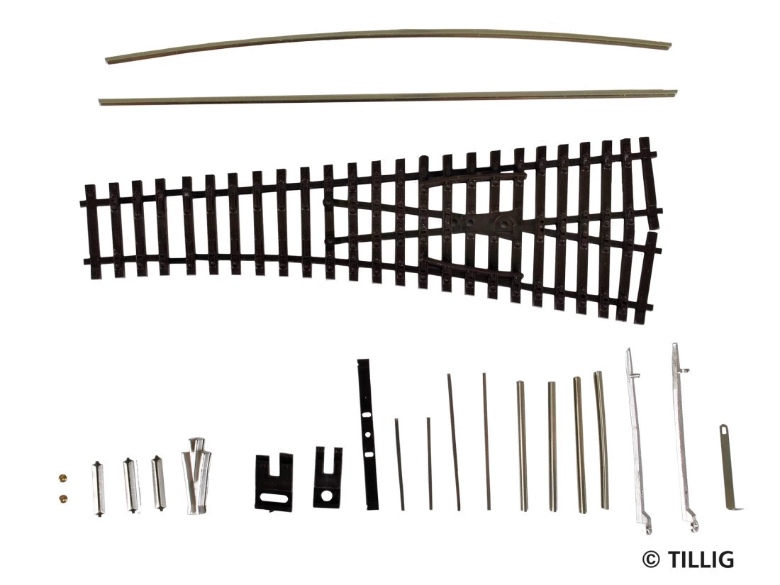 Modell: Spur TT. Gleis Einfache Weiche rechts EW1 129,5mm 15 Grad Bausatz. Das Tillig TT-Modellgleissystem mit 2,07 mm hohen Schienenprofilen aus Neusilber hat neben blanken auch brünierte Schienenprofile. Weichen sind mit verschiedenen Herzstückwinkeln im Sortiment. Neben einfachen Weichen gibt es zahlreiche weitere Formen wie Innenbogen-, Außenbogen- und Doppelkreuzungsweichen, doppelte Gleisverbindungen und Dreiwegeweichen. Zusätzlich zu den angebotenen Gleisradien gibt es Flexgleise mit verschiedenen Schwellenarten: Holzschwelle, Stahlschwelle und Betonschwelle. Außerdem werden fast alle Gleiselemente auch als Bausatz angeboten. Ergänzt wird das Modellgleissystem durch die STYROSTONE®-Gleisbettung mit echtem Schottermaterial. Damit erhalten die Gleise auf schnelle und einfache Art ein Schotterbett, ohne dass ein aufwendiges Einschottern per Hand notwendig wird.