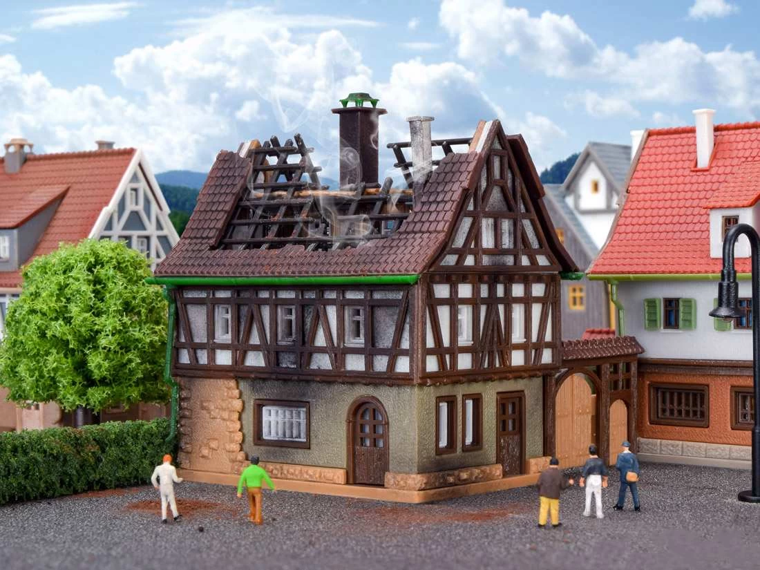 Modell: Spur Z. Dieses Gebäude mit ausgebranntem Dachstuhl kann mit der beiliegenden Farbtablette individuell gealtert werden. Mit den Rauchgeneratoren aus dem Vollmer Sortiment und einem entsprechenden Rauchdestillat kann passender Rauch erzeugt werden.